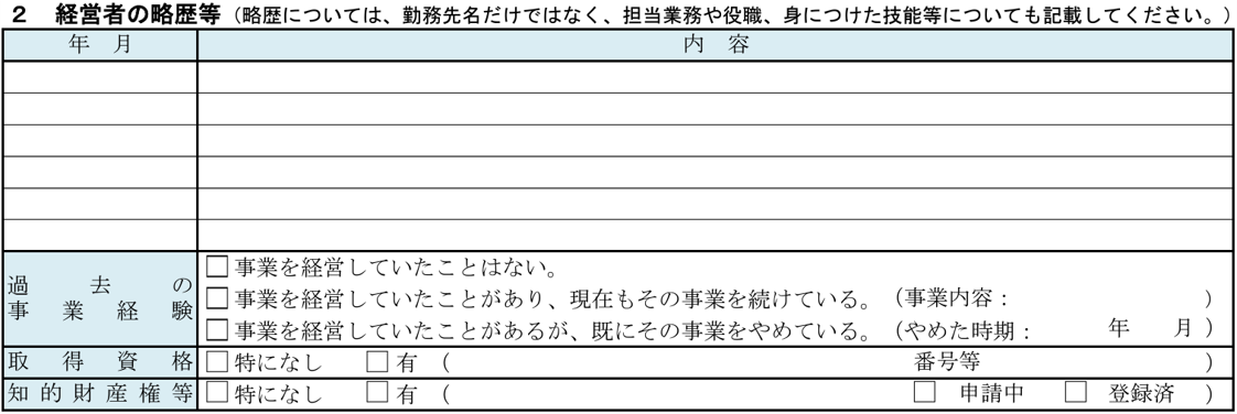 「経営者の略歴等」では、自分がどのような人物で、飲食店を経営するうえでどのような強みを持っているのかを示します。