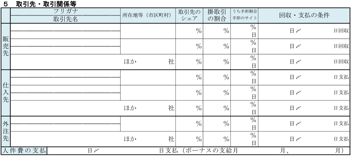 「取引先・取引関係等」には、食材や飲料の仕入れ先、業務用機材の提供元など、店舗運営を支える外部パートナーを記載します。