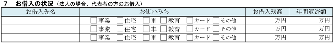 「お借入の状況」では、既存の借入金や今後の資金調達予定を正確に記載しましょう。住宅ローンや車のローン・教育ローンなどを記入します。