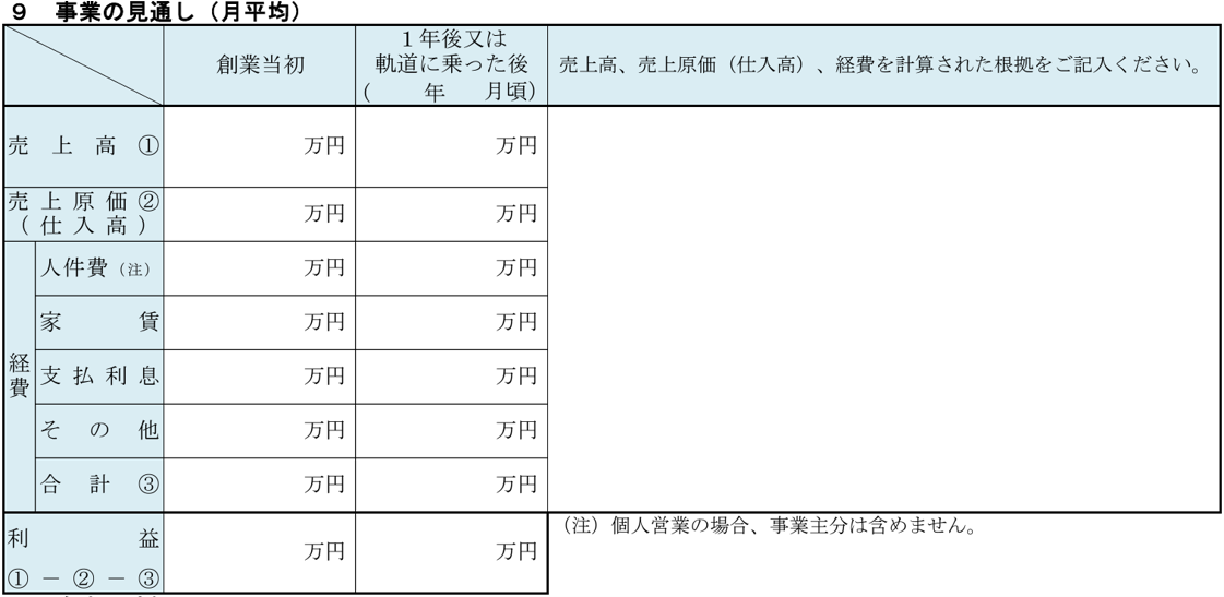 「事業の見通し(月平均)」では、開業後にどの程度の売上や利益を見込むかを数字で示すことが求められます。