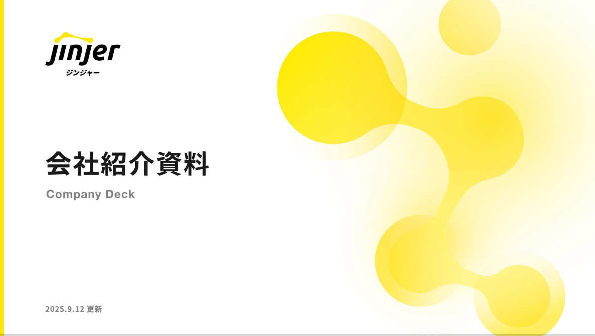 jinjerの採用ピッチ資料は、HRテクノロジー領域での成長性や革新的なサービスをわかりやすく描いているのが特徴です。