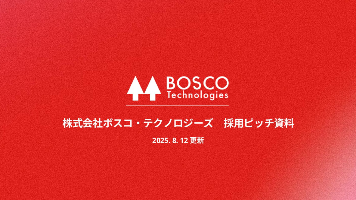 ボスコ・テクノロジーズの採用ピッチ資料は、DX(デジタルトランスフォーメーション)や社会インフラ開発など、同社の事業のコアテーマを軸に構成されています。